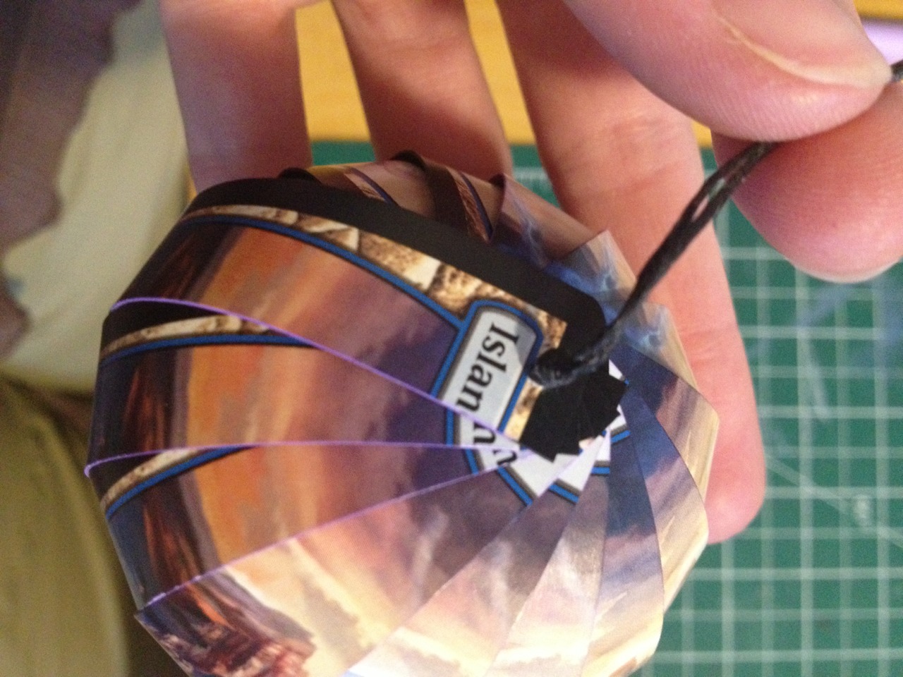 6. Start threading on the top of your card pieces. Start with the same card you began with in step 4. The bulb should begin to take shape. Optional: you can put a knot in your thread to mark how tall you want your bulb to be and snug your pieces against that.
